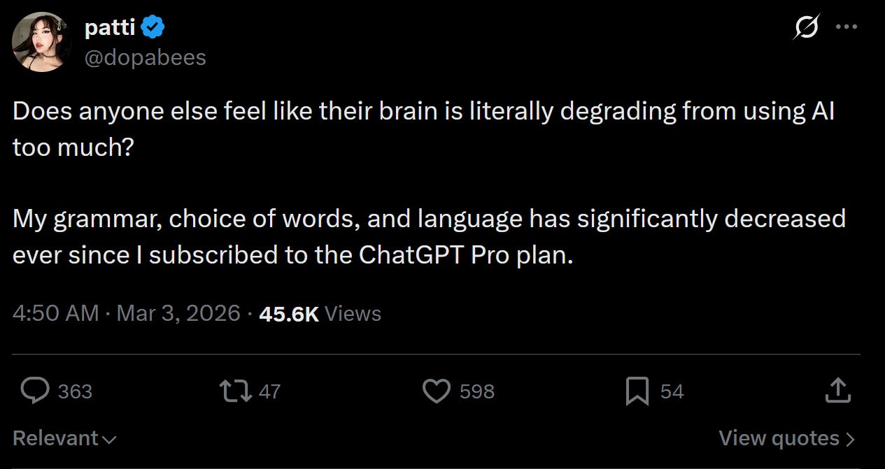 A recent post on X gained considerable traction. User @dopabees described experiencing cognitive decline since subscribing to ChatGPT Pro - deteriorating grammar, difficulty reading paragraphs aloud, an inability to enjoy strategy games that previously engaged her, and a growing sense that her own writing had become infantile compared to GPT output. Tens of thousands of views, widespread resonance. The implicit thesis: AI degrades cognition.