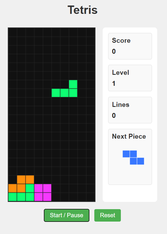 It implements features the coder doesn’t. Next-piece preview on a separate canvas. Pause functionality. Hard drop with spacebar. Touch controls for mobile with swipe detection. Lines-cleared counter. Level progression that scales reasonably (new level every 10 lines, matching the standard Tetris formula).