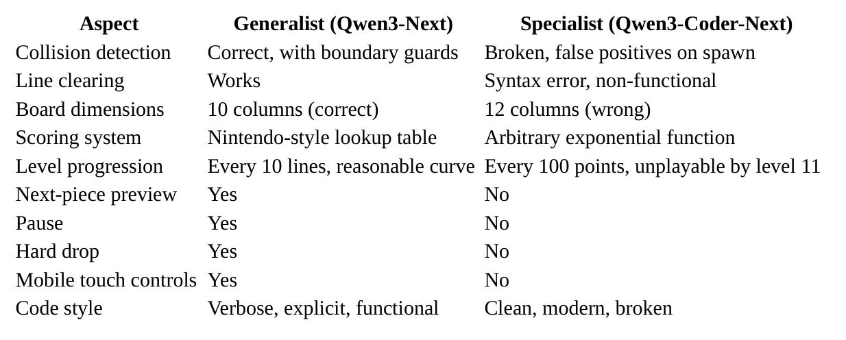 Qwen3-Next (the generalist) produced a Tetris game with some cosmetic bugs - a few missing values in arrays, likely tokenization artifacts - but with fundamentally sound game logic. You can play it.